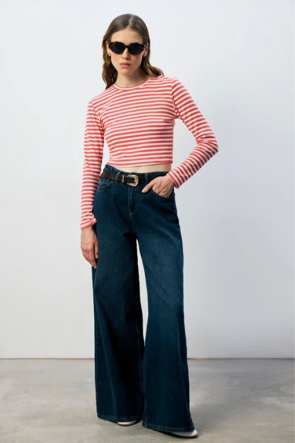 %100 Pamuk Çizgili Basic Örme Tişört Kırmızı