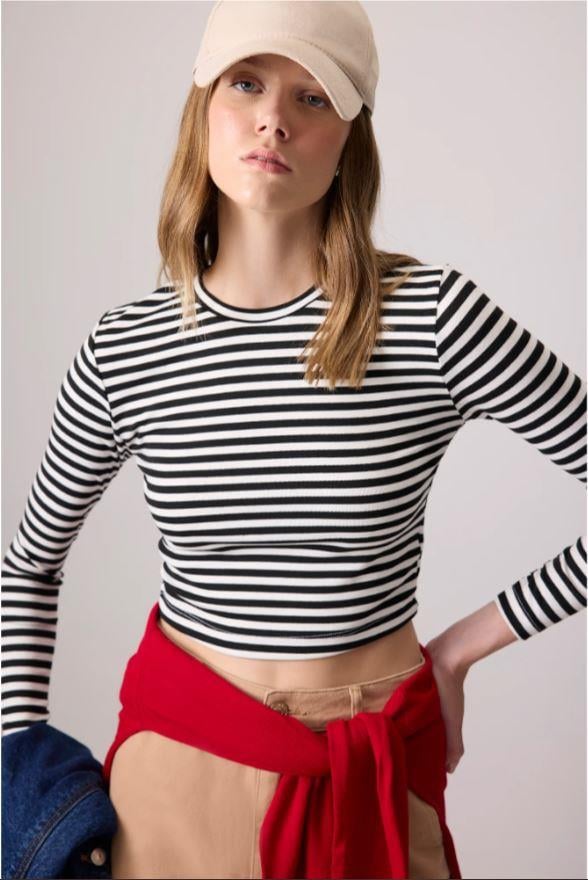 %100 Pamuk Çizgili Basic Örme Tişört Siyah