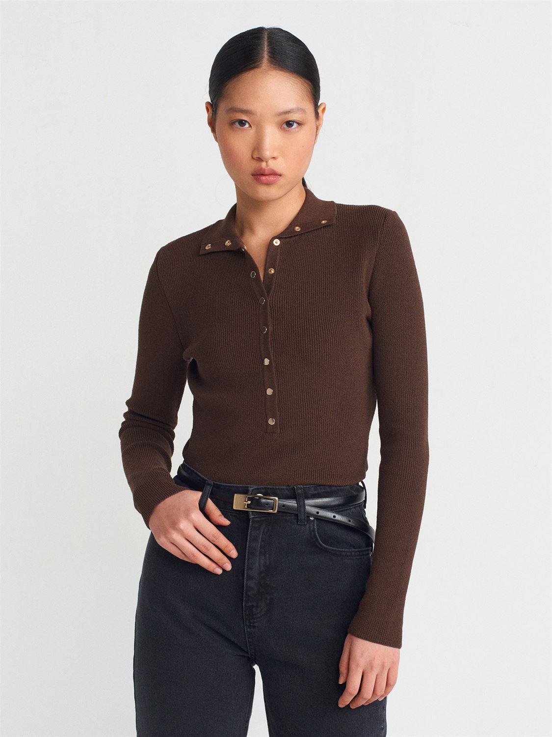 Dik Yaka Çıtçıtlı Triko Kazak Kahverengi