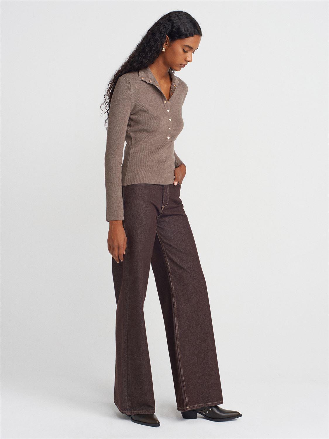 Dik Yaka Çıtçıtlı Triko Kazak Vizon