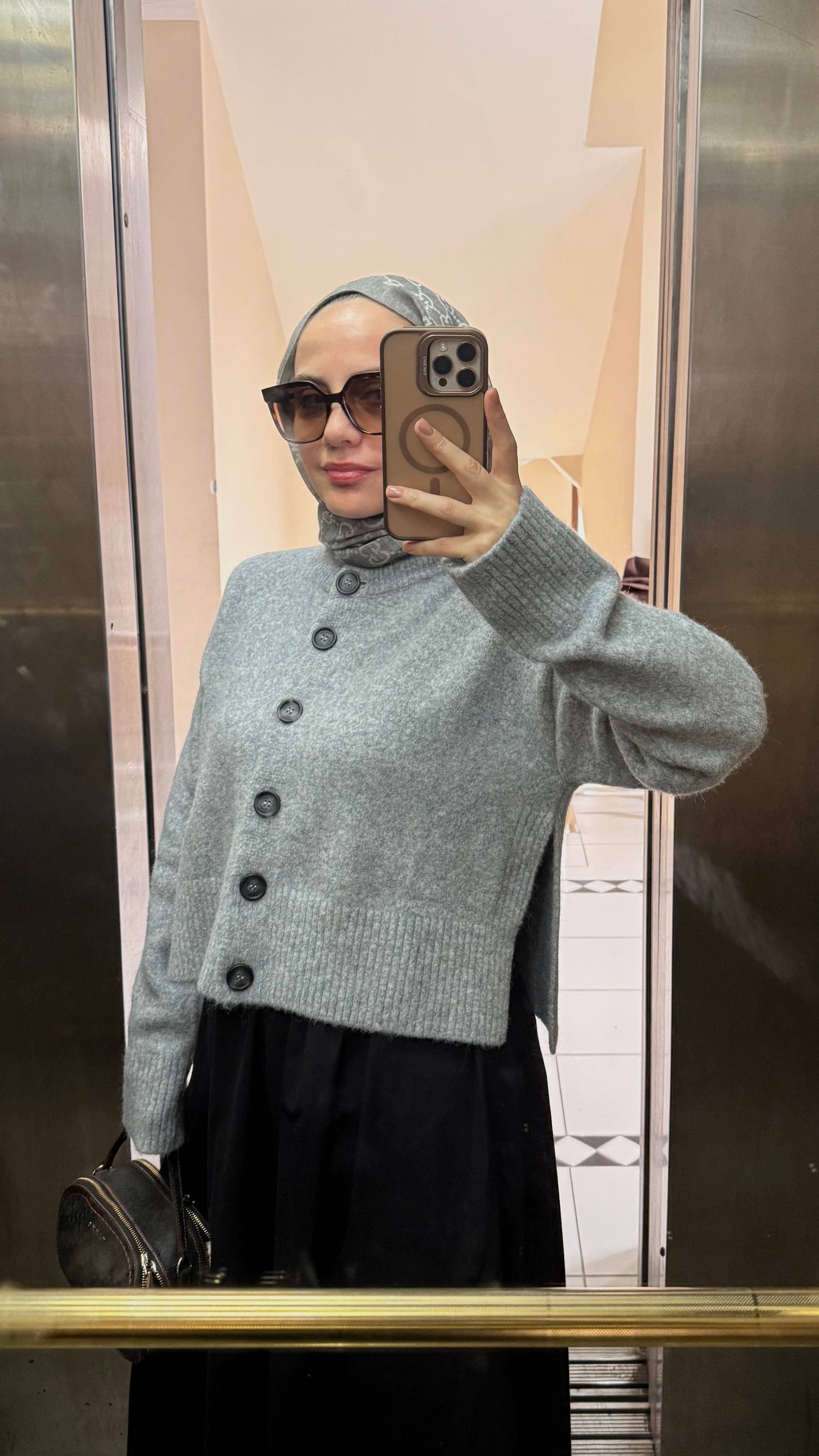 Dik Yaka Düğmeli Yumuşak Dokulu Yırtmaçlı Triko Hırka Gri