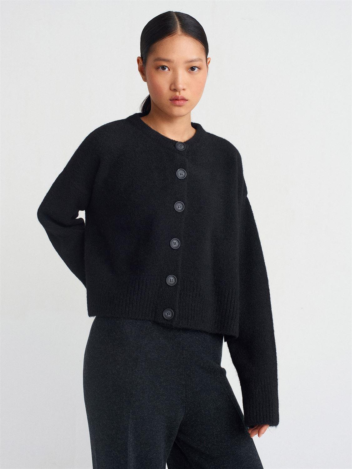 Dik Yaka Düğmeli Yumuşak Dokulu Yırtmaçlı Triko Hırka Siyah