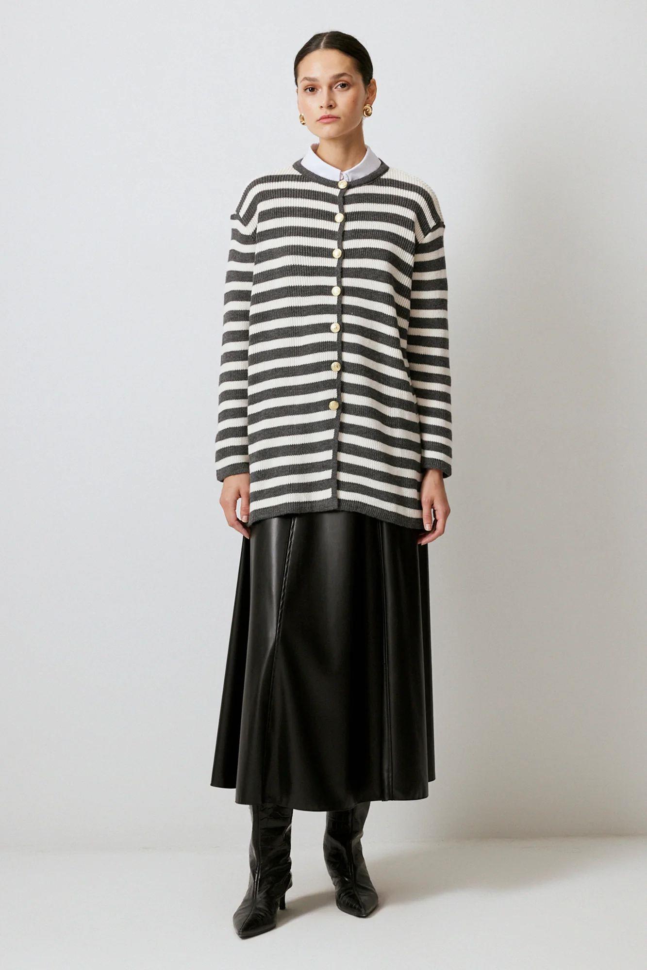 Touche Gold Düğmeli Çizgili Uzun Hırka Antrasit