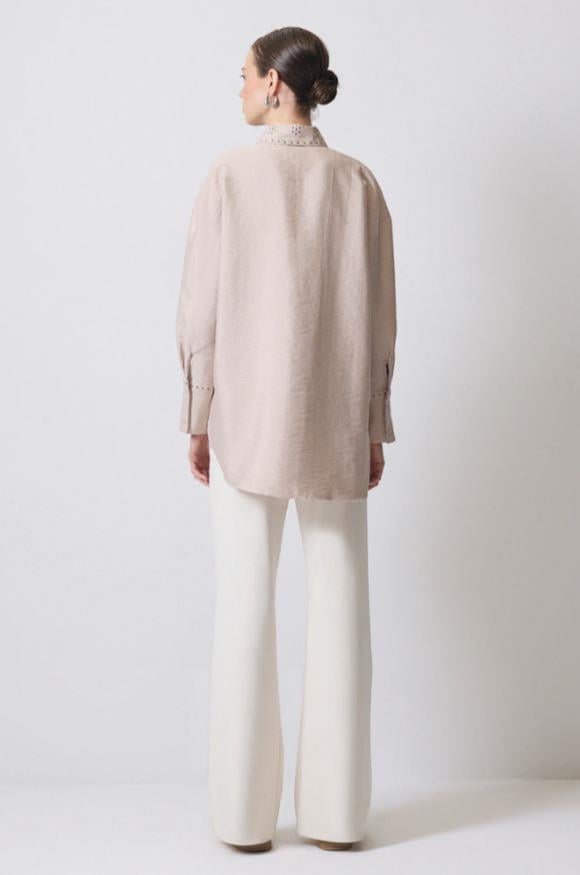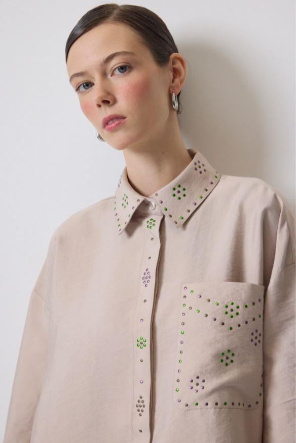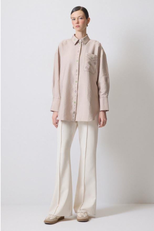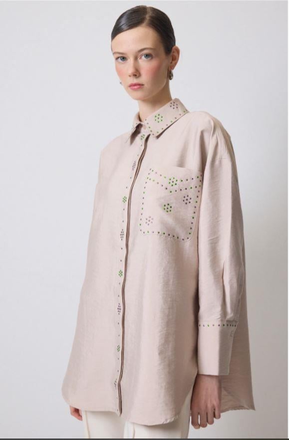 Yaka kısmında brode işleme detaylı, ön kısımda düğme ile kapamalı, tam omuz kalın manşetli gömlek.