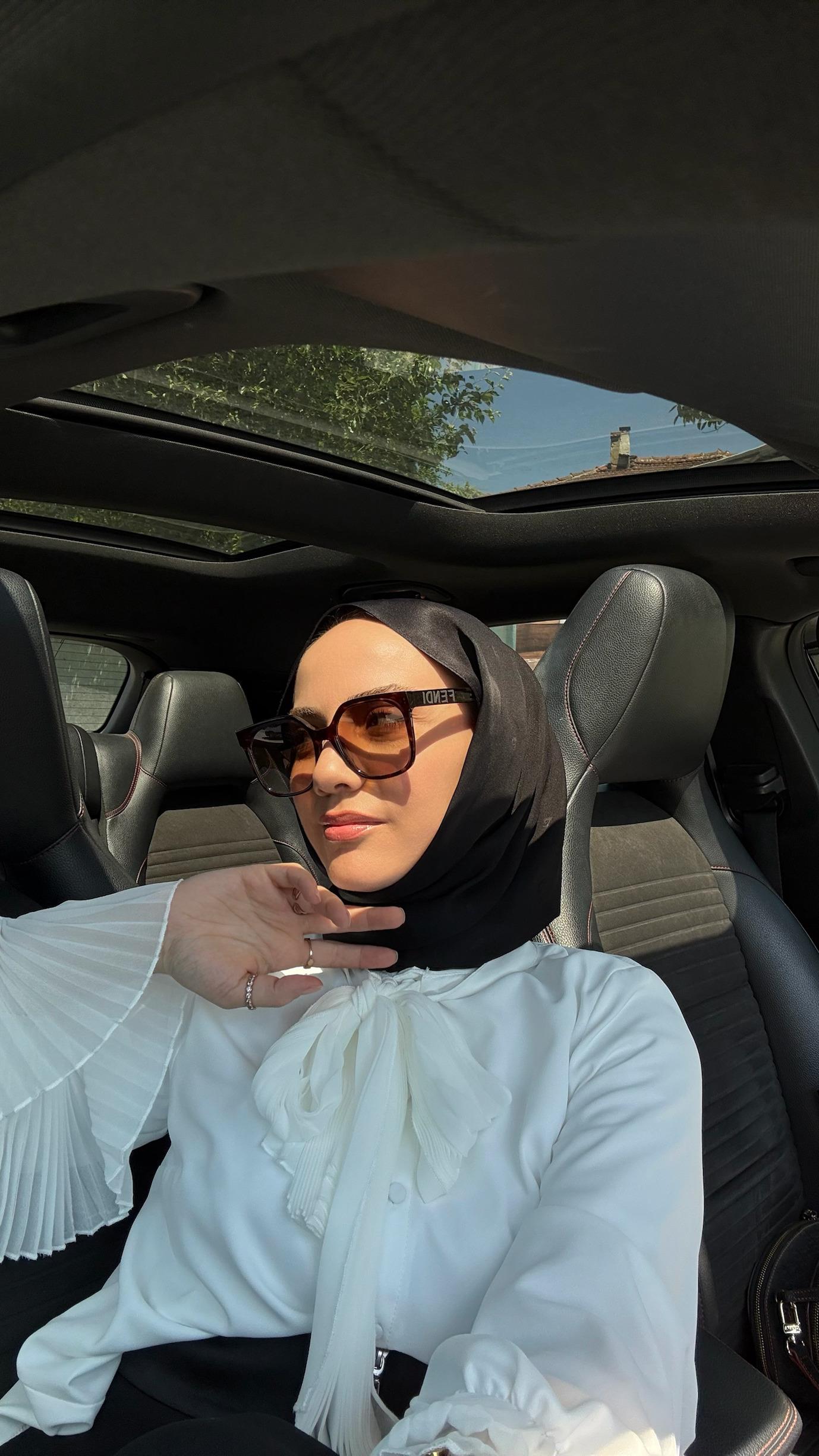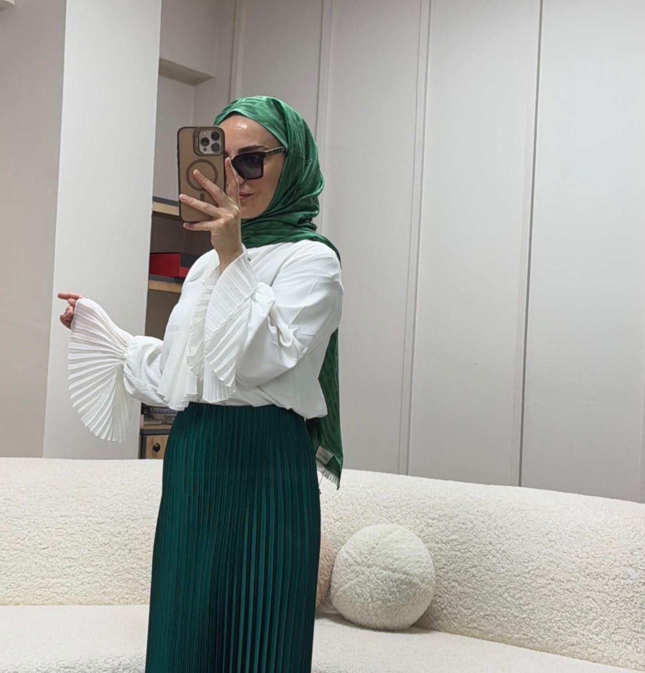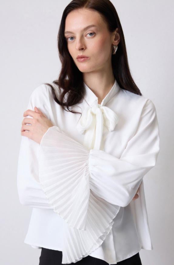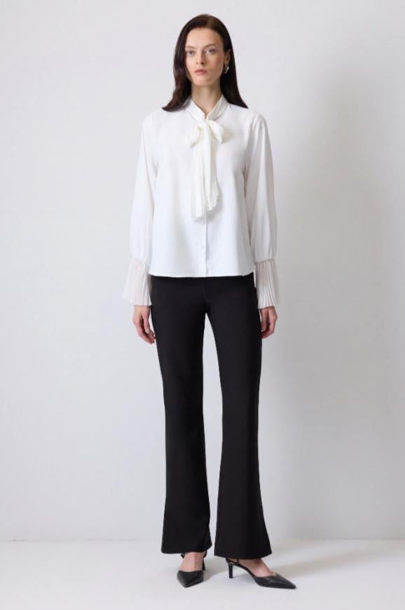 Touche Şifon Pilise Fular Yaka Bluz Beyaz
