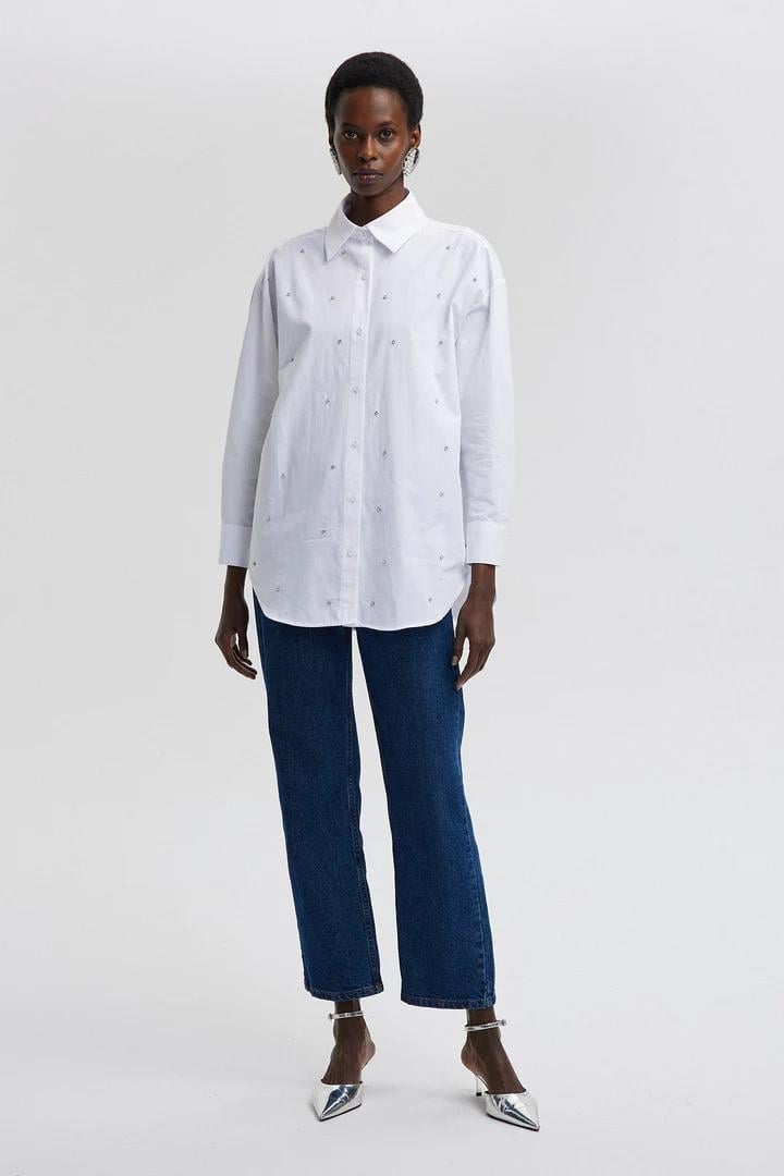 Touche Taş Detaylı Oversize Gömlek Beyaz