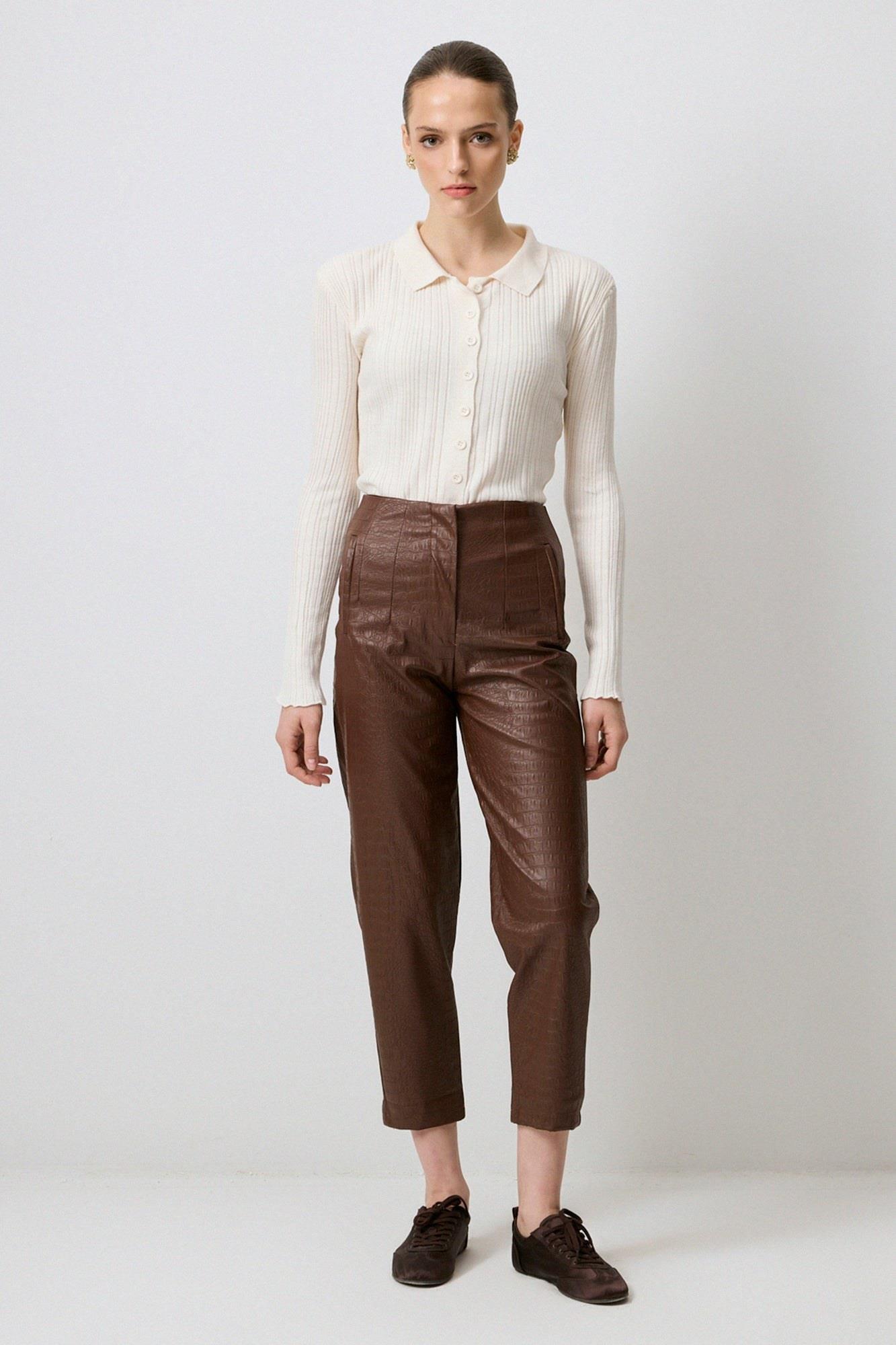 Touche Timsah Desen Yüksek Bel Deri Pantolon Kahverengi