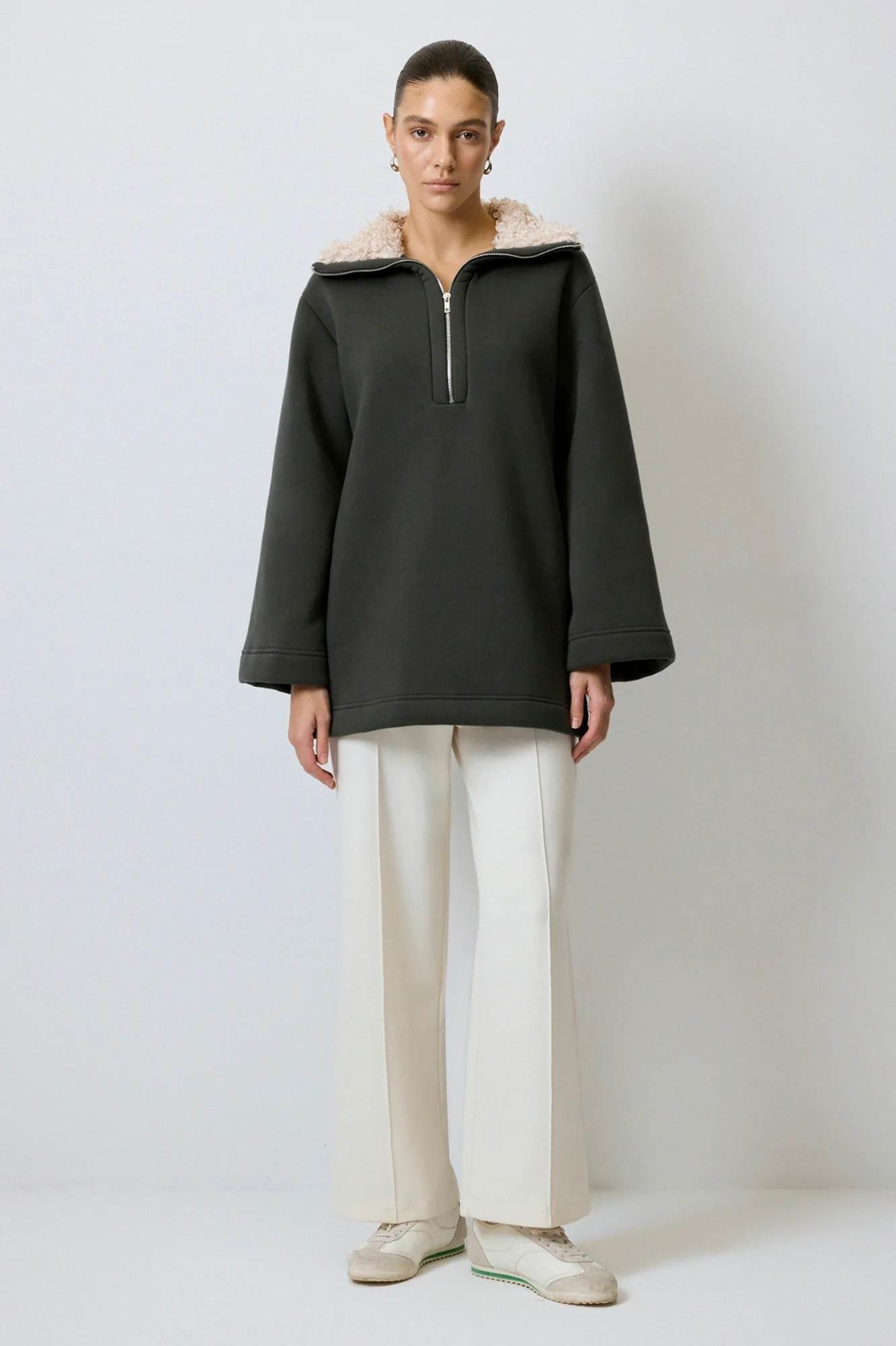 Touché Privé uzun kollu sweatshirt, fermuar kapamalı ve kürklü yakası ile öne çıkıyor. Oversize formu ile fark yaratan bu tasarım, lüks dokusu ile son derece konforlu hissetmenizi sağlıyor. Şehir stilinize lüks bir dokunuşta bulunan bu ayrıcalıklı tasarım, pantolonlar ile beraber modern bir görünüm kazandırıyor ve stilinizi bir adım öne taşıyor.